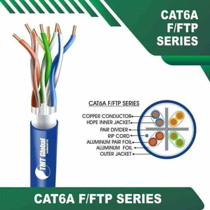 TMT Global Cat6a F FTP Cable 23awg 4 twisted pair 305m are Manufactured Tested and Complied with IEC 60332-1-2 EN 50173-1:2011 ISO/IEC 11801:2011(Ed. 2.2) ANSI/TIA/EIA-568.2-D IE C61935-2:2010(Ed.3.0) EN 50173-2:2007 including Amendment A1:2010 Requirements for Patch Cord Assemblies and Provide High Performance levels for structured cabling systems.Cat6a 23awg 4 twisted pair F-FTP Cable 305m